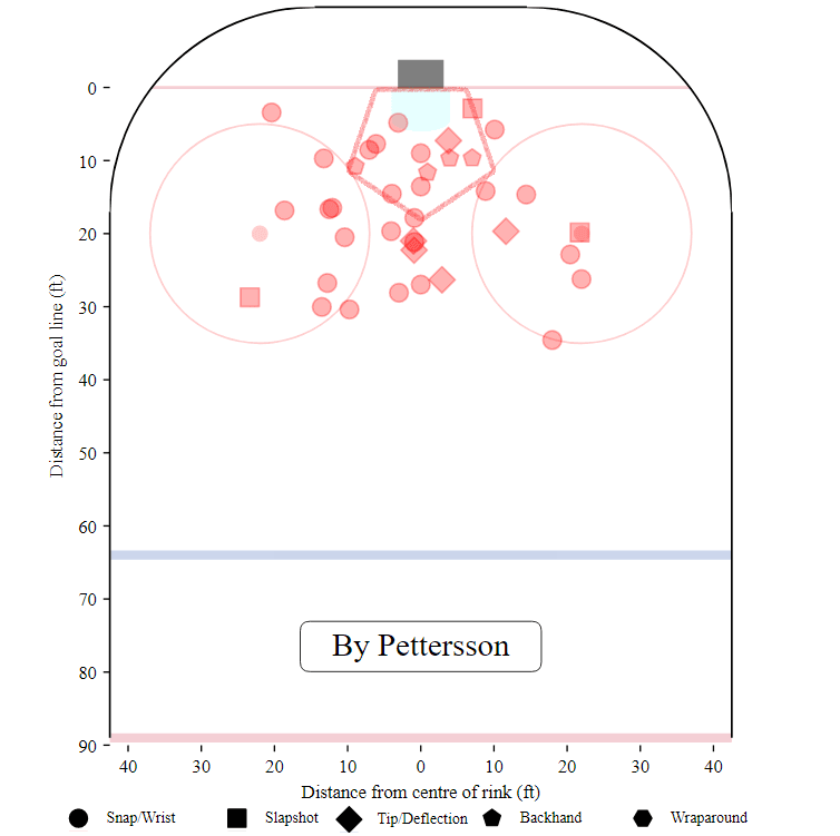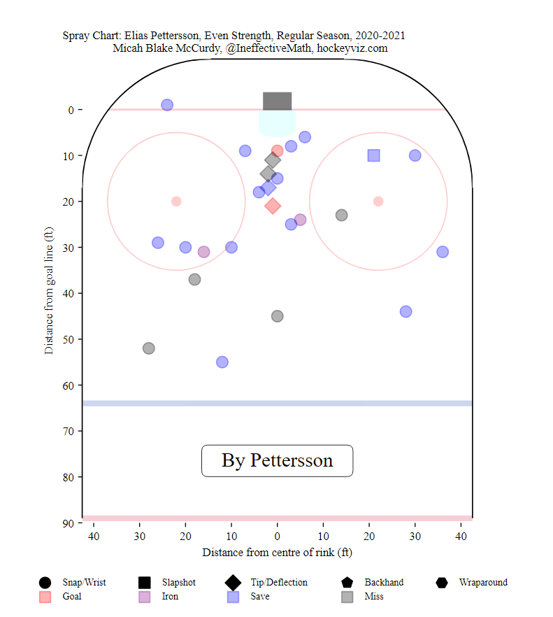 He’s proven time and time again that he can do it, Pettersson has always been a distance scorer. There really isn’t a spot in the offensive zone where Pettersson can’t score from, as indicated here from his career goals at five-on-five.