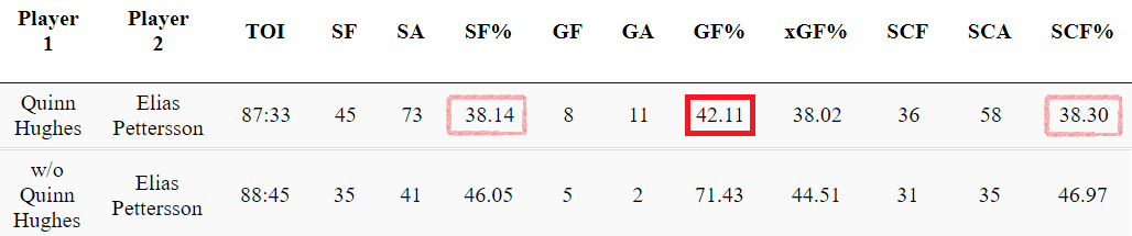 This season, with Hughes and Pettersson on the ice together they have given up a ton of goals against while Pettersson has had noticeably better defensive results without Hughes.