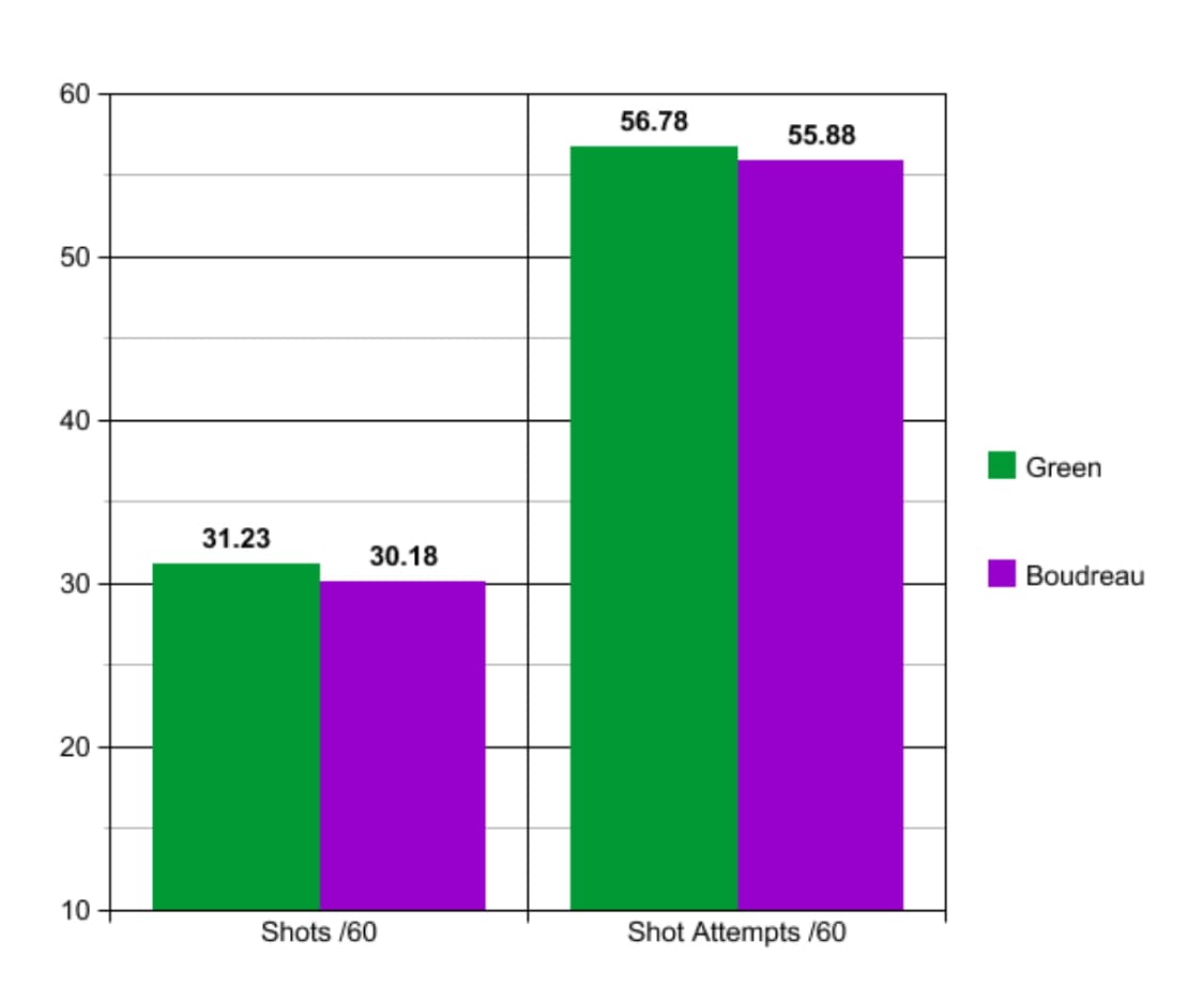 Analyzing shot volume differences from Green to Boudreau at 5-on-5 and how it affected the Canucks