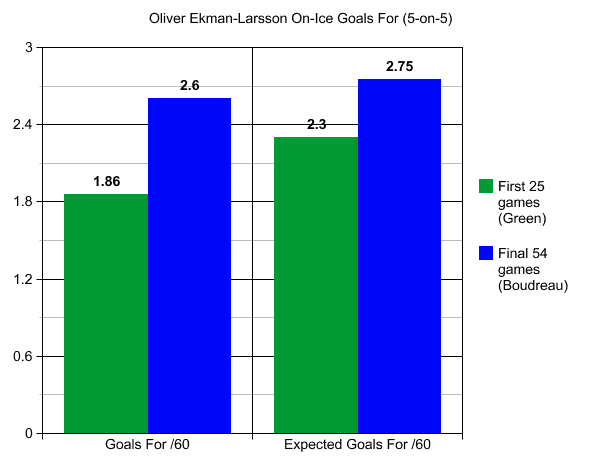 You see, OEL may have been 10th in shot attempts at the time of the coaching change but he was also without a five-on-five goal in the first 25 games of the season.