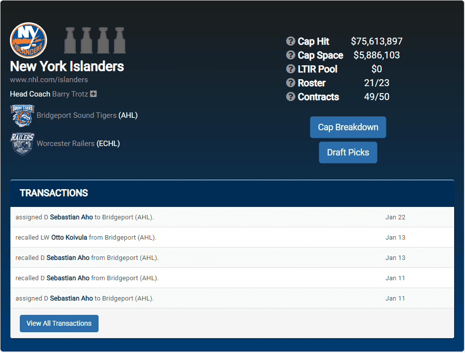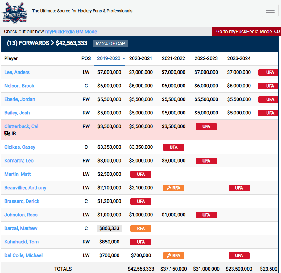 To find someone willing to take on Brandon Sutter, we’ve got to track down a franchise that is big on cap space and low on center depth. After flipping around for a while on PuckPedia’s main site, a clear contender emerged, with more than $5 million in projected deadline cap space and a dearth of pivots – the New York Islanders.