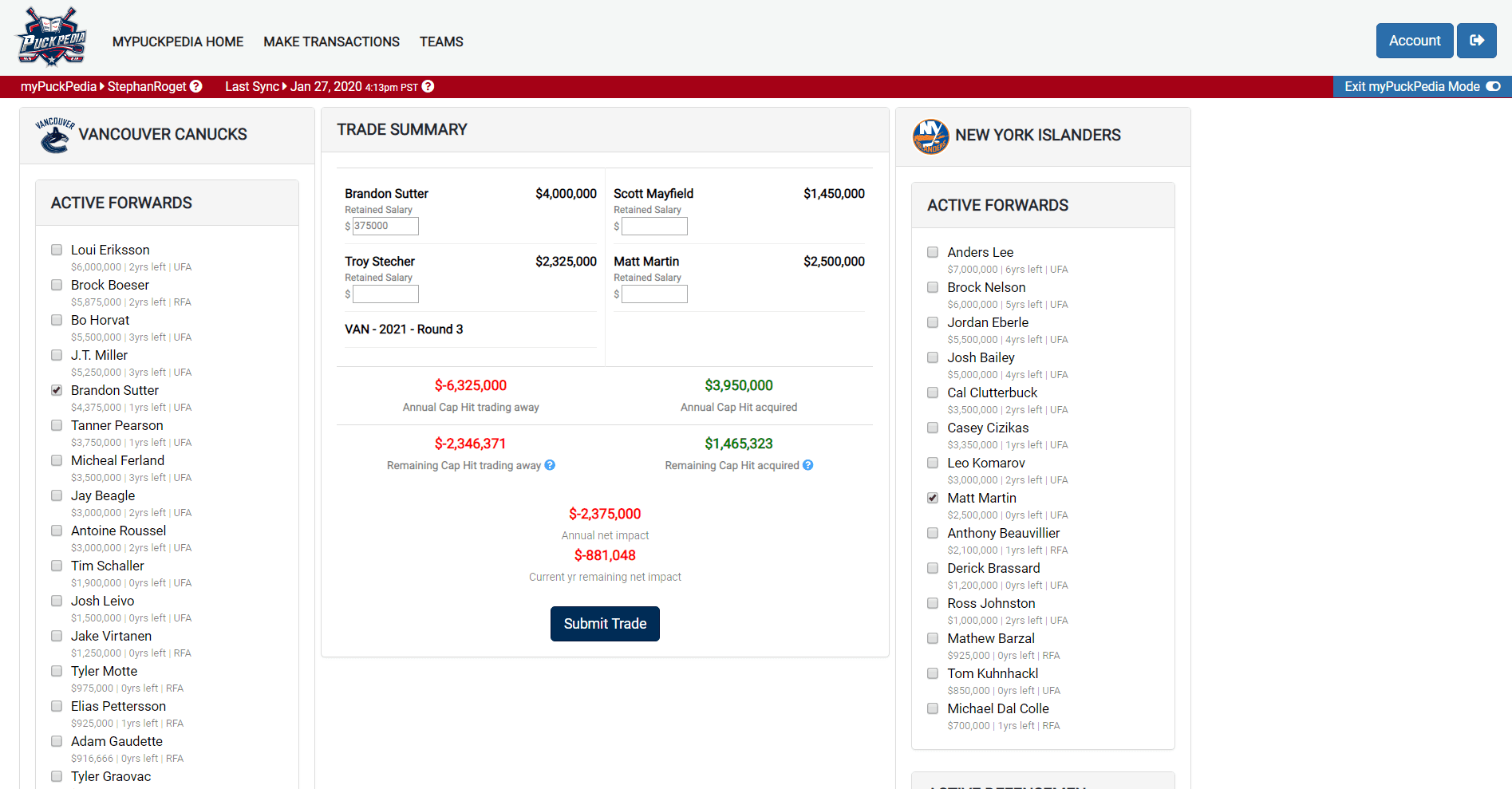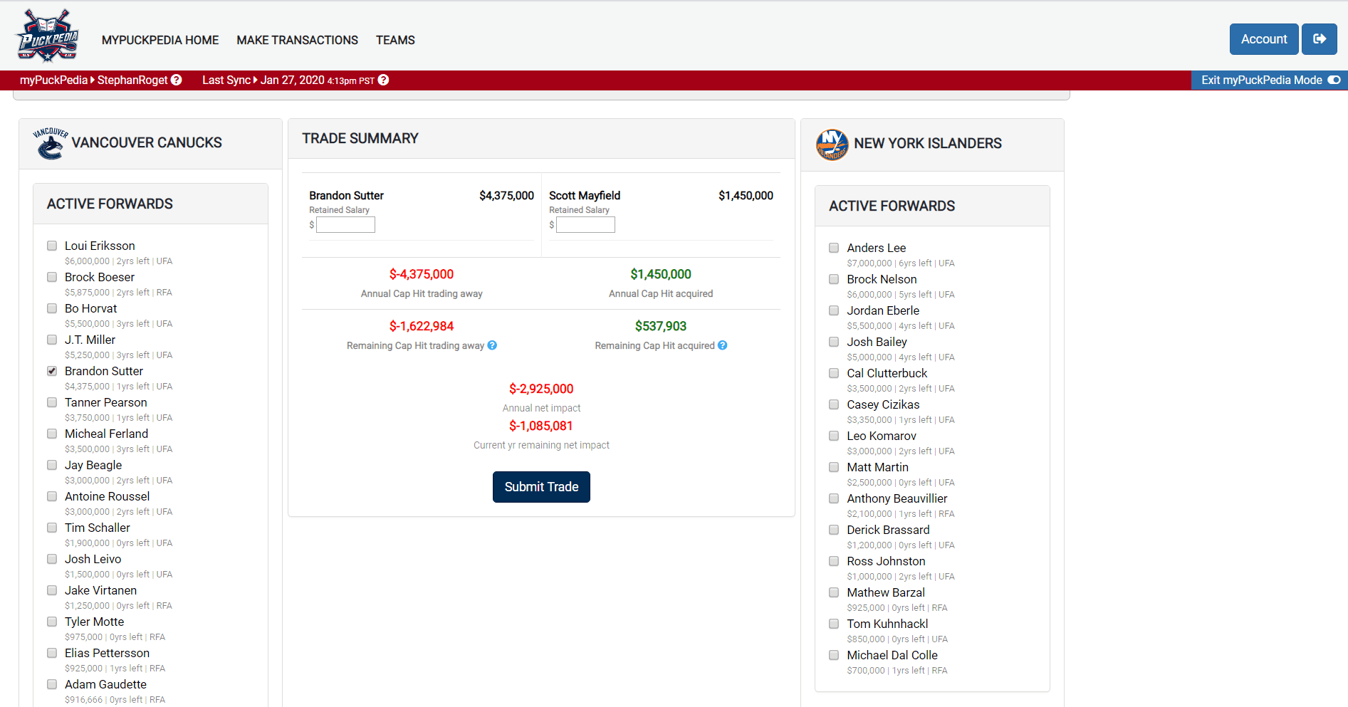 The Islanders are going to want to maintain their blueline depth for the playoffs, and Troy Stecher is an adequate replacement for Mayfield – one who might be more suited for their bottom-pairing that he is Vancouver’s. He definitely represents an item of value for the Islanders, but probably not enough to balance the discrepancy between Sutter and Mayfield – plus he only adds to the amount of salary headed toward the Islanders. Something – or someone – is going to have to tip this trade in the other direction.