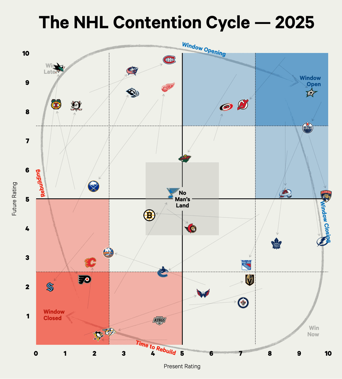 This shift in expectation can be seen quite clearly in The Athletic’s annual rating of the NHL’s “contention cycle.” In short, it’s a chart that attempts to place each franchise in one of nine categories of contender, from “Window Open” to “Window Closed” and everything in between.