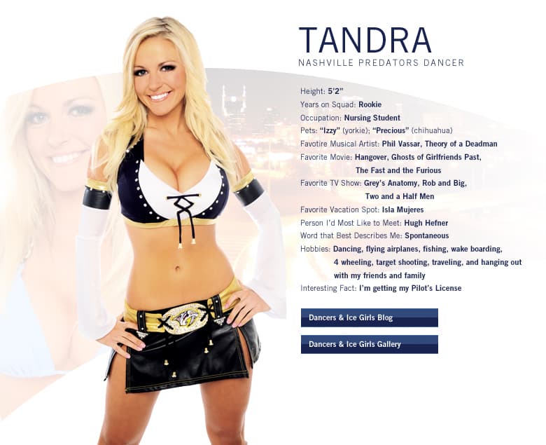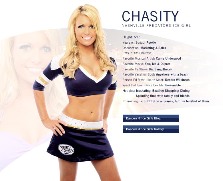 In keeping with our rookie theme I introduce you to two rookies in Nashville. The Predators have the Liquid Ice Girls and the Predators Dancers. Chasity is a rookie Ice Girl, and good news all you smart Internet nerds her favourite show is The Big Bang Theory.