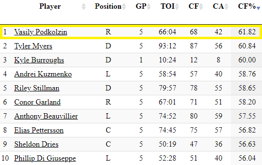 Last five-game Corsi numbers provided by NaturalStatTrick.com