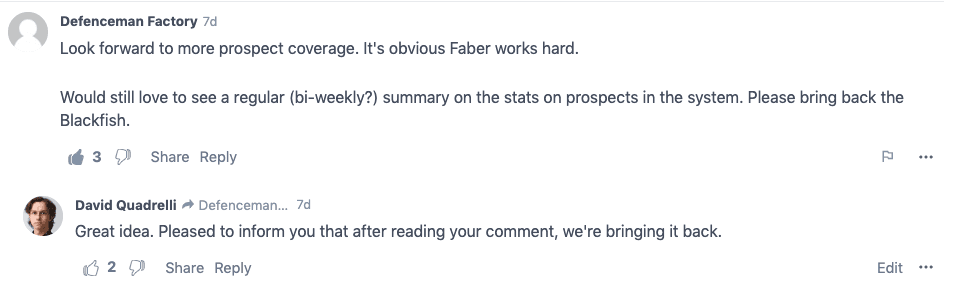 Three people wrote in votes for Blackfish — the longtime CanucksArmy weekly prospect report — to make a return, and after this comment on a recent article and a quick chat with Faber, we’re thrilled to announce that Blackfish will be returning as a weekly column starting tomorrow June 15th.