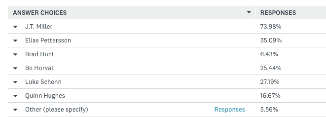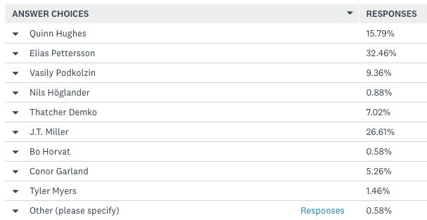 Somewhat unsurprisingly, Thatcher Demko ran away with this one, picking up over 80% of total votes, with J.T. Miller picking up 16% of votes, and Quinn Hughes garnering a hair under 2% of total votes.