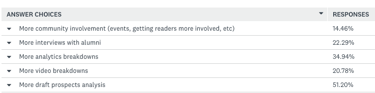 Far and away, our readers wanted more draft prospect analysis and I know Faber is licking his chops after hearing that answer.