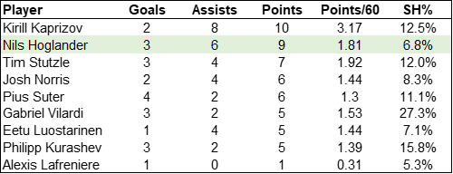 From a fancy stats perspective, things look good for Hoglander, at least at 5-on-5. He’s driving offence at a better rate than the current favourite in Kirill Kaprizov, and while the Wild forward has so far benefitted from some significant puck luck, Hoglander has experienced the opposite. Over the course of the season, we should see the gap between these two young forwards remain closer than many expect, although Kaprizov is still very likely to be ahead when all is said and done.