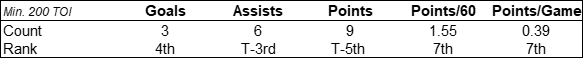 It’s great that Hoglander is 2nd among all rookies at 5-on-5 production without the boosting effects of power play points, but to stand any real chance at a nomination, he’ll need the second power play unit to start clicking to bolster his counting numbers and help him make up some ground. Other than Kaprizov and Stutzle, most of the rookies in the table above are also on second unit duty. If Hoglander had produced in line with the rest of his fellow rookies on the power play, he’d have an extra 2 points and would be 3rd in total points with 11 (rounding down from 11.4).