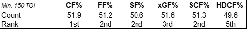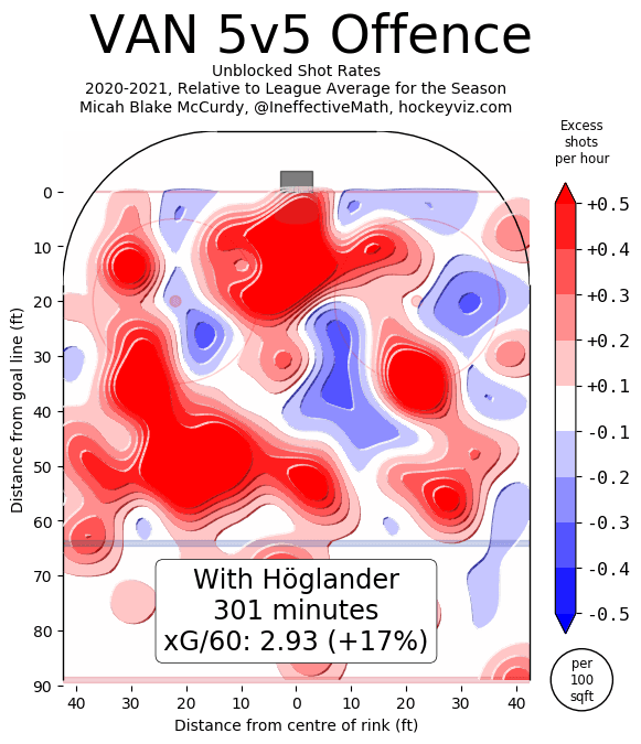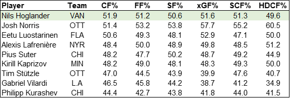 At 5-on-5, Hoglander has posted extremely strong shot metrics relative to his peers.