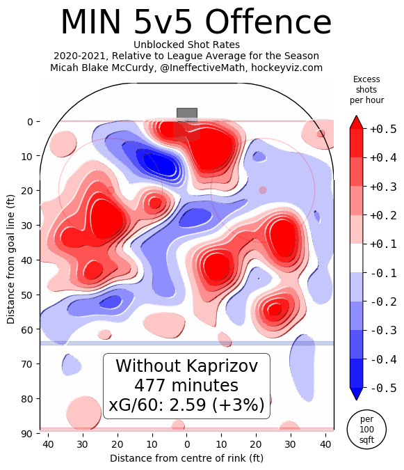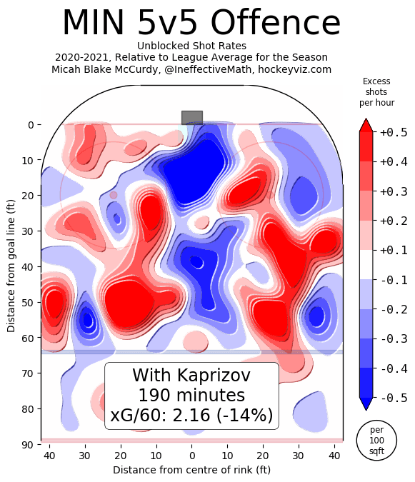 Hoglander’s effect on the Canucks’ 5-on-5 offence should come as no surprise. However, what’s interesting to note is that the Wild are actually worse off in terms of xG/60 when Kaprizov is on the ice despite Kaprizov’s strong 5-on-5 counting numbers. Part of this can be attributed to Kaprizov’s IPP of 83.3 and on-ice team shooting percentage of 13.5%, both of which are likely to regress over the course of the season.