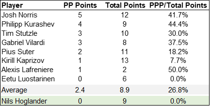 Despite his elevated role on the second line, Hoglander has been disadvantaged by being deployed on a stagnant second power play unit for the Canucks. This is reflected by the fact that Hoglander has yet to register a single power play point thus far, which is a major handicap for any Calder hopeful.