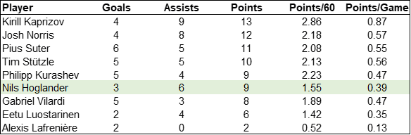 Of course, offence isn’t the only metric for player evaluation, especially with defencemen and the defensive side of the game also in need of consideration. For a stat that encapsulates any player’s contribution to his team, we can turn to Dom Luszczyszyn’s Game Score Value Added (GSVA) model, which gives a GSVA score to each skater. Unfortunately, goalies aren’t part of the model, so Kevin Lankinen isn’t included, but we can see that Hoglander ranks second among the most notable rookie skaters: