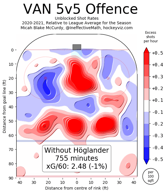 Within this forward group, Kaprizov is the current Calder favourite (he has the best betting odds) and is thus the best benchmark for Hoglander to compare against. For each player’s isolated offensive impact, we’ll turn to HockeyViz’s isolated impact charts to get a sense of each player’s impact on their team’s offensive abilities at 5-on-5.