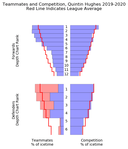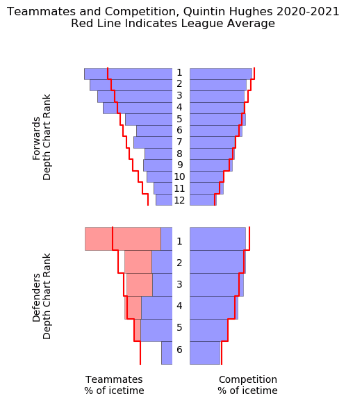 And Hughes, too, plays big minutes on a defensively-porous roster, but his deployment is not that out a shutdown defender. Hughes starts nearly 70% of his shifts in the offensive zone, faces less quality of on-ice competition than the league-average skater, and still comes out of it bleeding goals against.