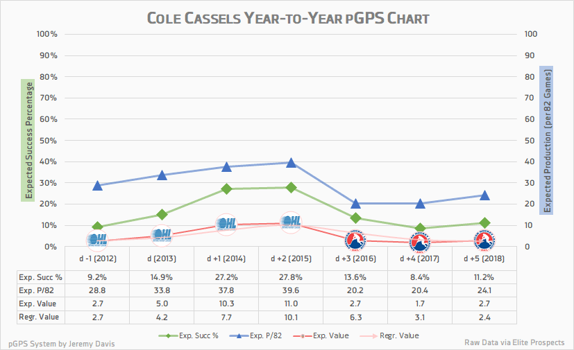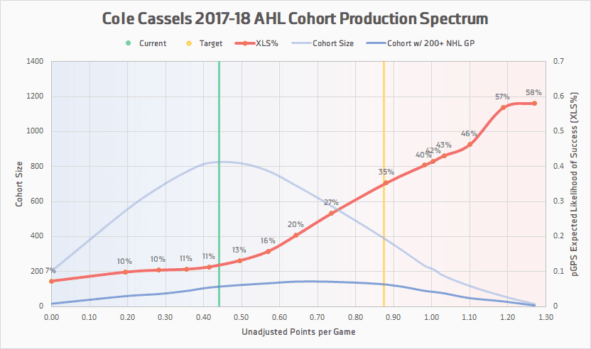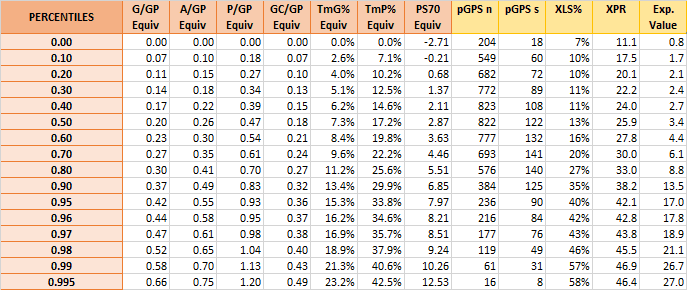 (Note: this won’t match up perfectly with Cassels’ current pGPS percentage, because the percentiles are even across all production factors, while a players will vary, i.e. he may be in the 35th percentile for points per game, but the 45th percentile for assists per game. But it will still be close to assigned projection.)