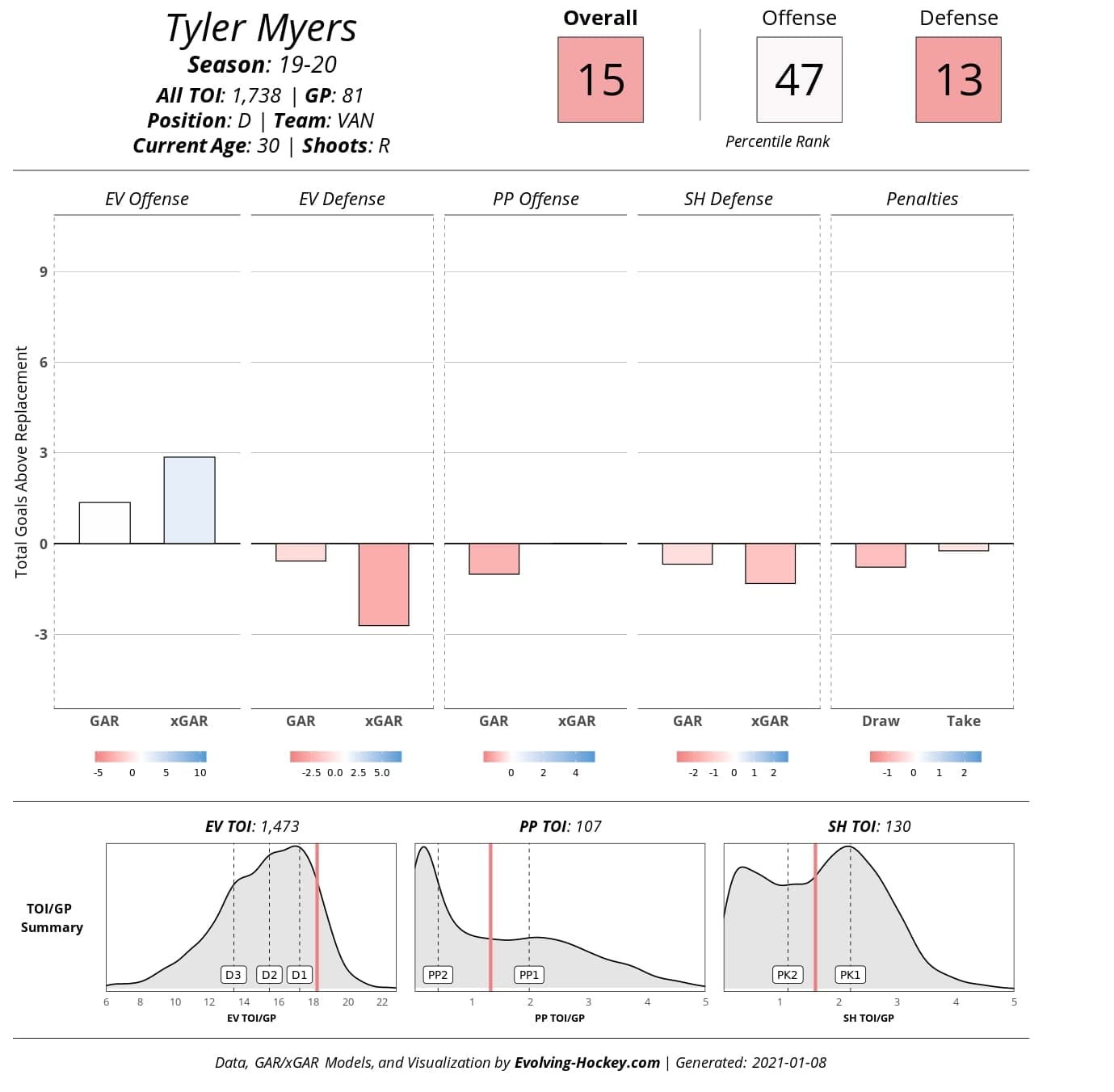What you will notice from that player card is that Myers has been positive offensively, both at even strength and on the power play through the past three years. The Canucks don’t need huge production from Myers aside from good puck-moving from the back end, so hopefully that can continue.