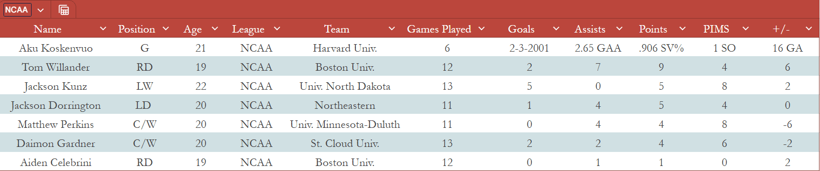 Speaking of Aku, he has now started all five of Harvard’s games this year, which we had predicted would happen. He allowed five goals on 40 shots to take his third loss of the season. Now winless in three games, he sports a 2-3-1 record with a .906 save percentage and 2.65 goals against.