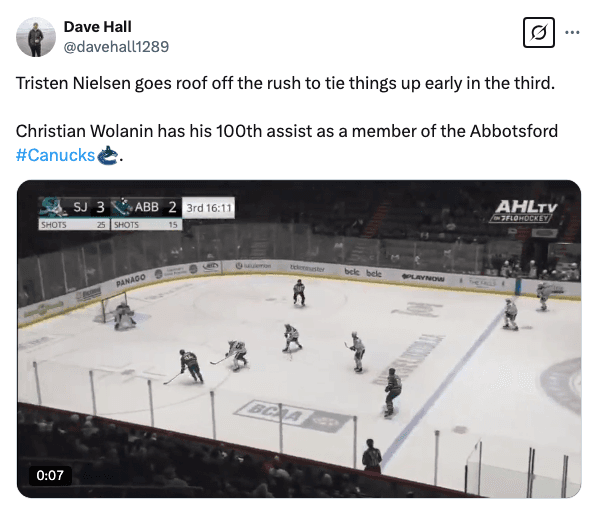 With the heads-up stretch pass, Christian Wolanin became the first player in franchise history to hit the 100 assist mark as a Canuck and is bow three points shy of Dries for third place in franchise points.