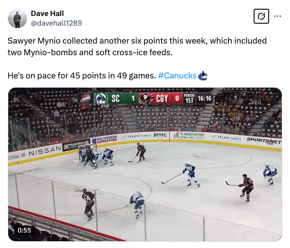 Over in the Western League, Sawyer Mynio continued to rack up points. With another three assists, he has eight points (three goals, five assists) over his last six games.