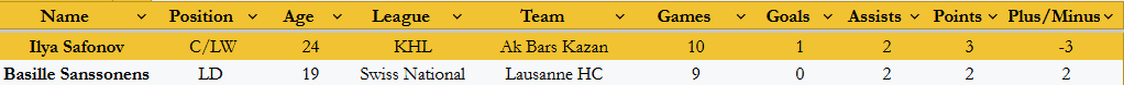 In Switzerland, Basile Sansonnens continues to trudge along in a minimal role amongst men. But he has played well. Although primarily used as a “fourth pairing” (extra) defender, he has jumped up to the third pairing from time to time.