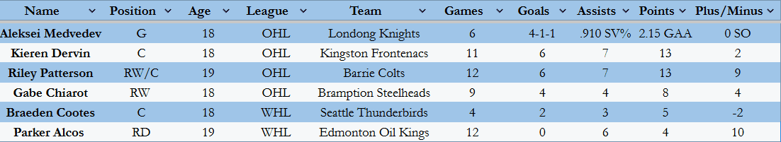 Finally, in London, Aleksei Medvedev continued his strong draft-plus-one season. He stopped 24 of 26 shots to pick up a 3-2 overtime win against the Ottawa 67’s.