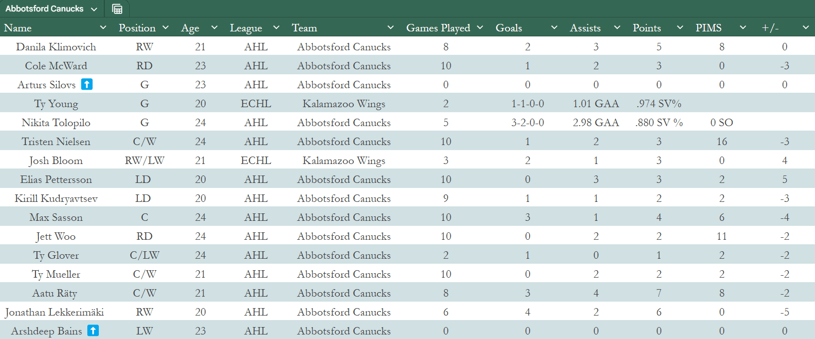Räty is arguably the most critical piece of the Canucks’ forward group right now. He’s averaging about 22 minutes per game and is being trusted in every situation—top line 5v5, powerplay, penalty kill, and dominating the faceoff circle with just under a 60% success rate. Unfortunately for Abbotsford, there is a strong potential that he will earn a call-up by the time this report comes out.