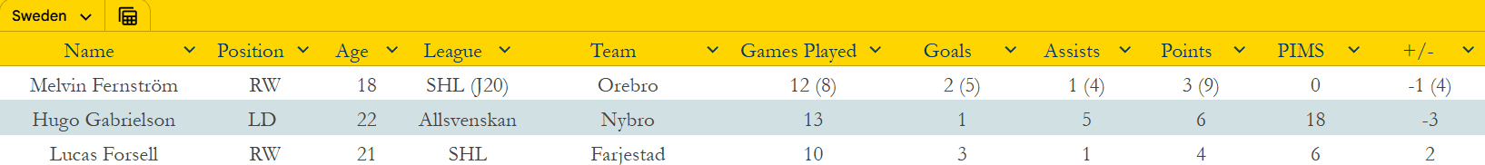 *As a quick note on Fernström’s stats, his ledger technically shows 12 SHL games. However, there are three games in which he did not see the ice at all and was used as a substitution. As a result, his ledger should technically show nine games as opposed to 12.*