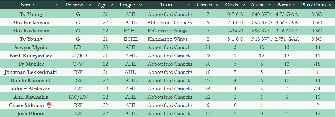 After dropping the first two games to the Bakersfield Condors, the Canucks rebounded by sweeping the Calgary Wranglers over the weekend. The results were enough to drag them out of the league basement and into 30th place (of 32).