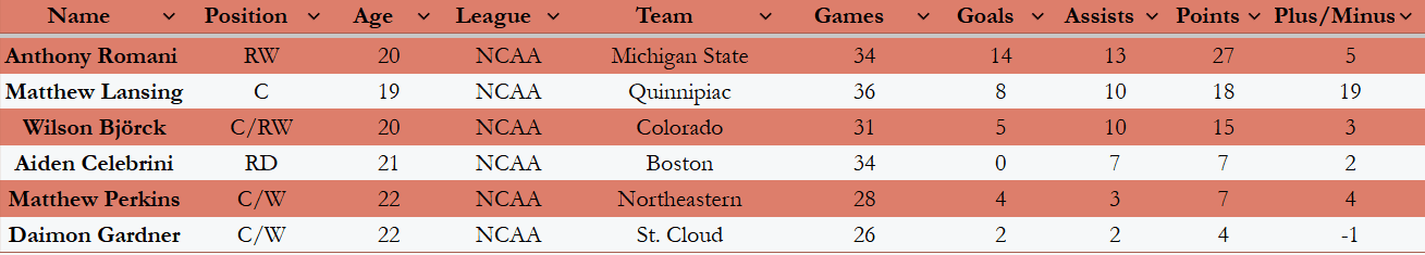 The only Canucks NCAA prospect eliminated this week was Wilson Björck, whose Colorado College squad dropped back-to-back games in their best-of-three series.
