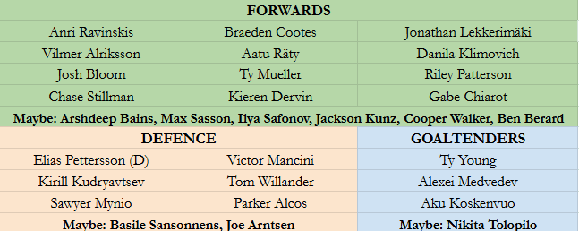 Some players sit in the “too old for this, but maybe” category: Arshdeep Bains, Max Sasson, and Nikita Tolopilo. All are established enough that their inclusion isn’t guaranteed. But if they need additional players or want to give them additional reps, they could still be brought in to suit up.