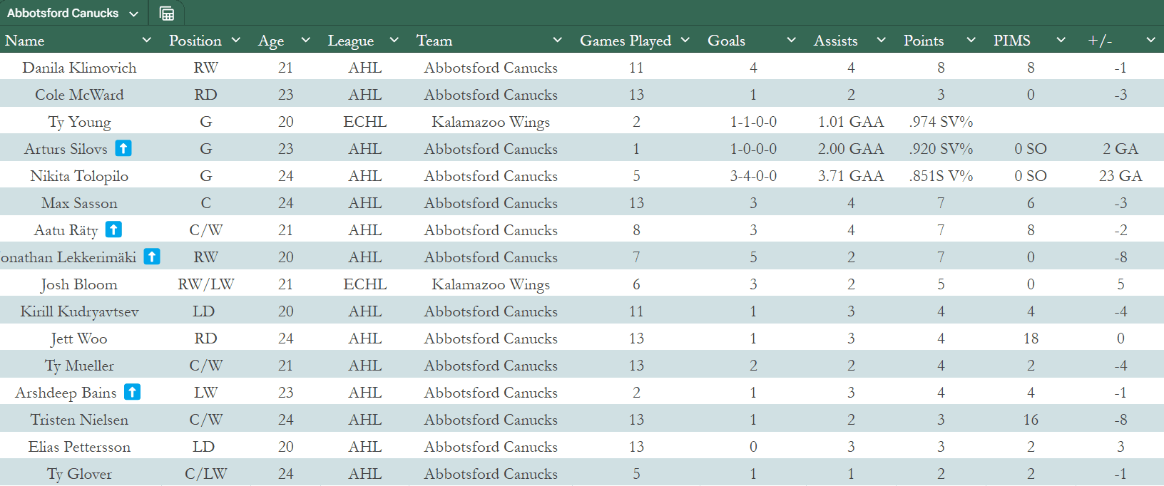Speaking of that line, Max Sasson has been heating up after a slower start, grabbing three assists on the week to put him up to seven points (three goals, four assists) on the year—tied for second on the Abbotsford Canucks.