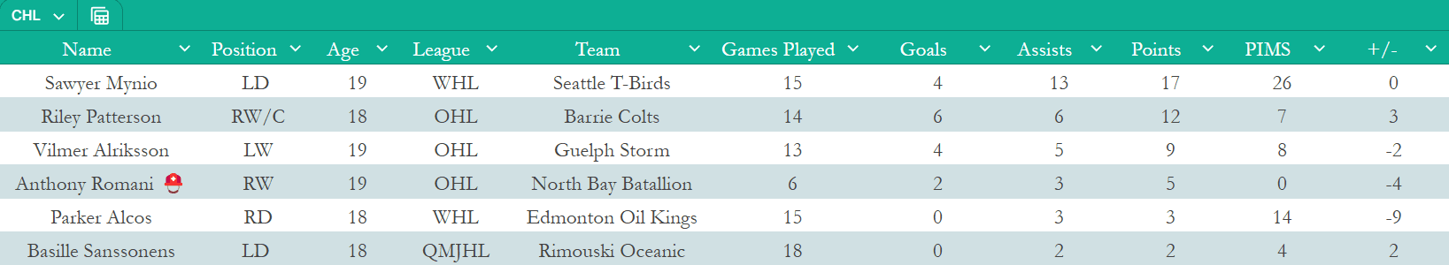It was a relatively quiet week for the remaining CHL representatives. Sawyer Mynio collected a secondary assist in just one game of action—a 4-3 overtime loss to the Calgary Hitmen. Today, he sits ninth among all WHL defenders with 44 shots through just 15 games. He also sits with the fifth-highest point total among that field, with four goals and 17 points.