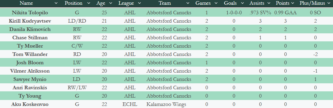 It’s been a strong opening stretch for the Canucks’ pipeline. Abbotsford looks deep, the CHL kids are already producing, and the NCAA class is finding its footing quickly.