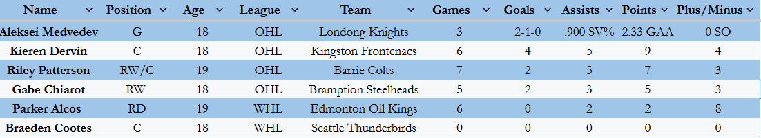The biggest story in the OHL remains Kieren Dervin, who has exploded out of the gate in his draft-plus-one campaign. The Kingston centre added another two goals and three assists this week, bringing his total to nine points (4 G, 5 A) through six games.