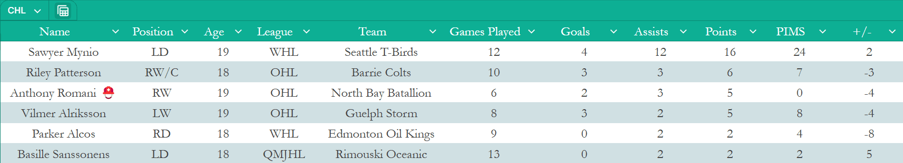 After a quiet two-game stretch last week, Sawyer Mynio blew up to record a goal and six assists across four games. He’s now up to 16 points in 12 games, ranking second among all WHL defencemen and leading his Seattle Thunderbirds squad. Mynio’s early-season numbers put him on pace for an impressive 87-point season out of the gate.