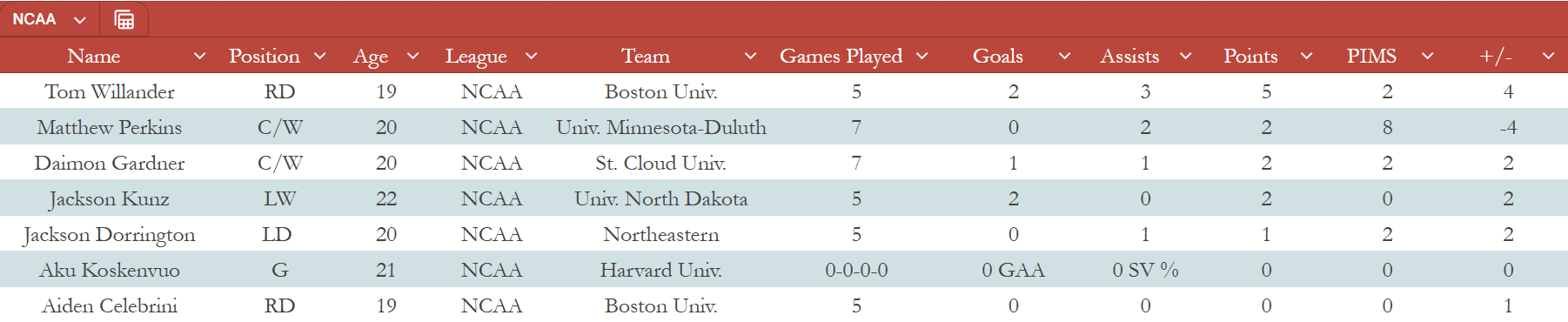 As a purebred defensive defenceman, Jackson Dorrington isn’t lighting up the scoresheet, with just one secondary assist so far. However, his defensive play is showing up as usual — he’s second on Northeastern in blocked shots (six), leads the team in hits (17), and has the highest plus/minus rating (plus-2) among the team (Northeastern is not very strong with a 1-3-1 record). Dorrington is averaging around 22 minutes per game and playing key roles on the penalty kill and shutdown units.