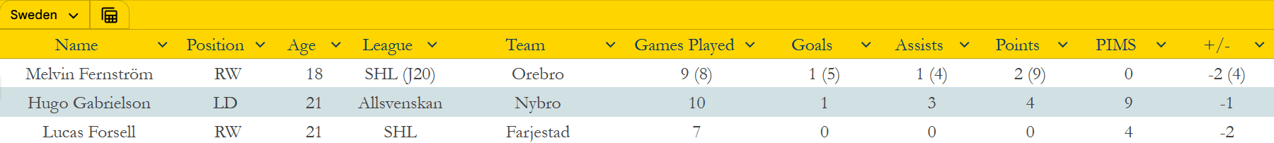 The roller-coaster year carries on for Melvin Fernström. He played a J20 game on Wednesday — grabbing a goal and an assist — followed by two SHL press box visits to fill in as a substitute on Thursday and Saturday. He returned to the J20 squad on Sunday, adding two more assists. Fernström has nine points (five goals, four assists) in eight games with the junior squad.