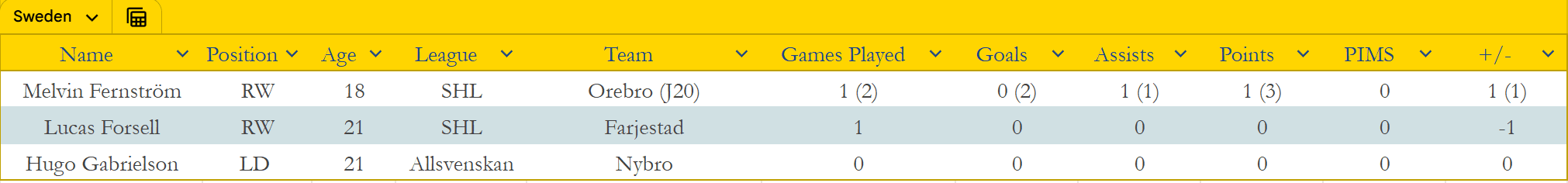 Speaking of warming the bench, Lucas Forsell also made his season debut after skating in six Champions League matches. Unfortunately, he was right back to the sub-10 minutes of ice time we saw last season. Färjestad is expected to be an SHL powerhouse, so it is disappointing that we may not see Forsell enjoy increased minutes as we had hoped.
