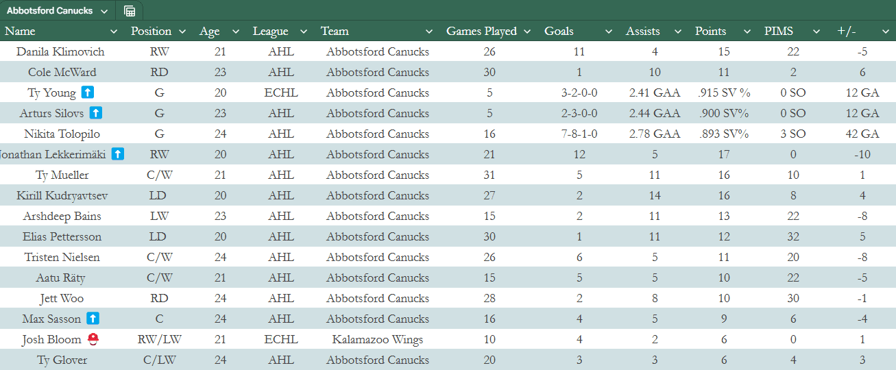 Although, Ty Young is back in Abbotsford after being sent back down in mid-December. He posted a 2-2-0-0 record during a four-game stint down in Kalamazoo, allowing 10 goals on 109 shots.