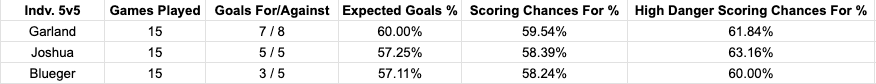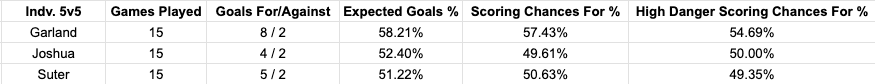It’s easy to look at the goals for/against column and determine that Suter in between Joshua and Garland was more successful than Blueger through their first 15 games. However, that doesn’t paint the full picture. Look past the goals and look at the analytics.