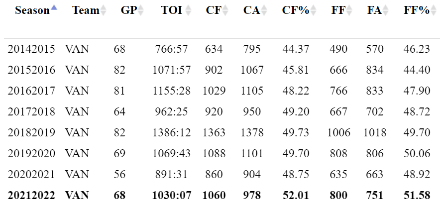 Never before has Horvat and his line controlled more than 50% of the scoring chances in a season, but they’re doing it in 2021/22.