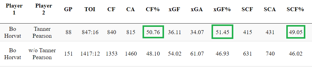 His faceoff percentage skyrocketed last season putting him near the top of the league with a 57.3% faceoff winning percentage. He is relied upon to be the centre out on the ice at the end of games to put a lead to sleep. Since adding Tanner Pearson to his wing, Horvat has been able to control the Corsi for percentage for the first time in his six-year career. He has also been controlling the expected goal share and been just under 50% for control of scoring chances.