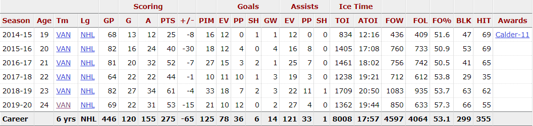 Drafted as a player who projected as a middle-six centre, Horvat has been able to find success on the power play unit to drastically boost his scoring totals over the past few years, including a 12 power play goal season last year in only 69 games.