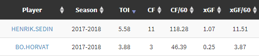 Meanwhile, the stymied Sedin unit produced twice as many shot attempts per hour, and an expected goal rate three times as high as that of Horvat’s unit.