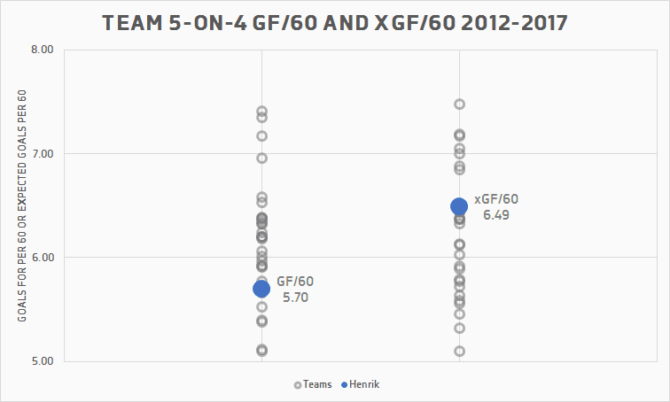 Between 2012-13 and 2016-17, Henrik had a 5v4 GF60 (5-on-4 goals for per 60 minutes) of 5.70. That’s not great: it would still sit 27th in the NHL if we counted it as Vancouver’s rate.