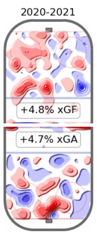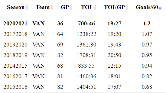 The addition of Höglander has given a boost to his scoring but the big jump in goals comes from his team-leading six power play goals. Coming off a year in 2019-20 where he scored 12 of his 22 goals on the power play, it has been nice to see Horvat find more success at scoring at even-strength alongside Höglander this season. He is currently scoring at the highest rate of his whole career.