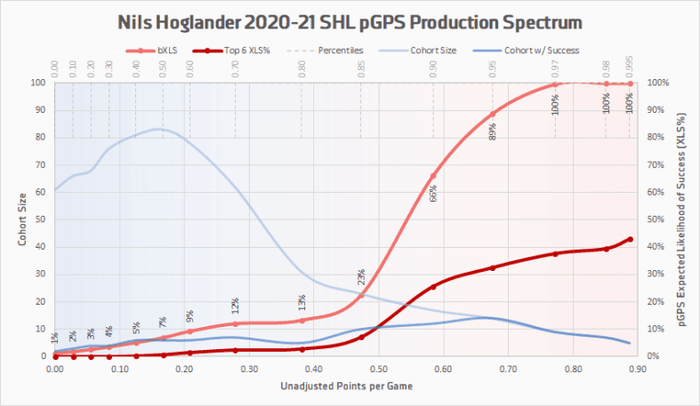 As you can see from the pGPS production spectrum, anything over 0.5 points per game in the SHL during your draft +2 season gives you a good percentage of being an every day NHL player. If Höglander were to break out and get over 0.75%, he is sitting at about a 97.5% chance of being an NHL player while grabbing about 37.5% chance of being a top six type NHLer.