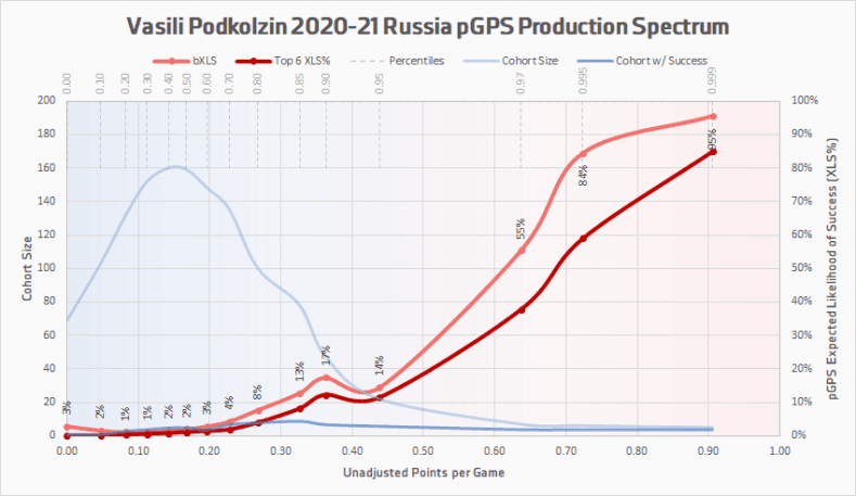 As the pGPS production spectrum indicates; if he is able to get about 35-40 points in 60 games, then he will have a high chance of being a top six player at the NHL level. According to the pGPS, if Podkolzin is able to tally over 0.68 points per game this season he has over 50% odds of being a bonified top six player in the NHL.
